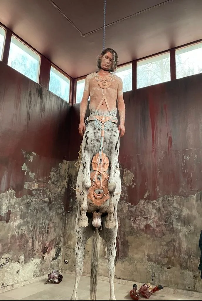 The Denmark pavilion had a warning sign at the entrance, as the installation was shocking. The title was “We walked the Earth”, and showed a family of three centaurs in a post-apocalyptic world. The female centaur was shown giving birth and the centaur was on display after having hung himself from the rafters. We were warned.