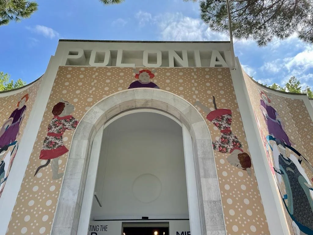 The Poland Pavilion was conceived by Małgorzata Mirga-Tas, a Polish-Romani woman, entitled Re-enchanting the World This is the first time an artist from the Roma community has been represented in the history of the Biennale. The façade was decorated in reclaimed fabric, as was the entire pavilion, created in 3 distinct bands: the upper band was inspired by the cycle of frescoes from Palazzo Schifanoia in Ferrara, Italy. The name of the villa means “escape from boredom” The middle band is an archive of female Roma history with tarot and zodiac symbols, and the lower band represents contemporary Roma life in Poland.