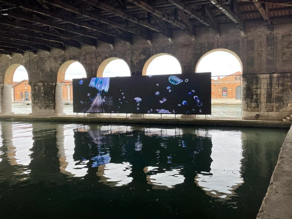 Outside, under arcades and reflected by the water of the Arsensale is Wu Tsang’s ‘Of Whales’, a 6-hour digital film installation. The 16 meter screen displays a series of images inspired by the 1851 novel Moby Dick by Herman Melville.